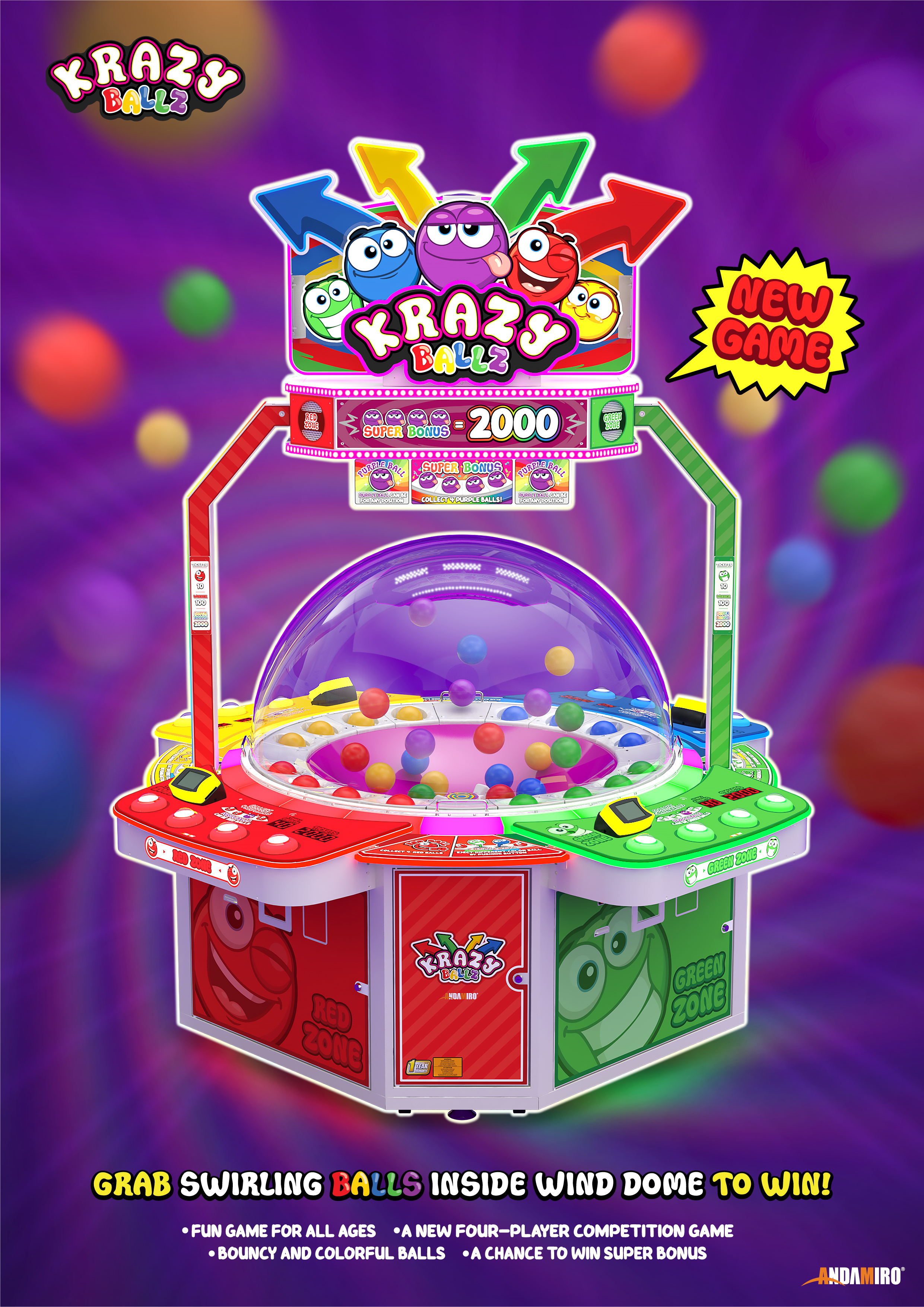 Boasting a 75″ x 75″ footprint (about 39 sq.ft.) and appealing to a wide audience, Krazy Ballz promises to be a lasting attraction among multiplayer redemption game offerings.