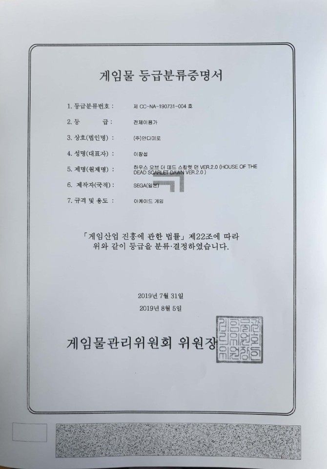 하우스 오브 더 데드 : 스칼렛 던 DX 등급분류필증