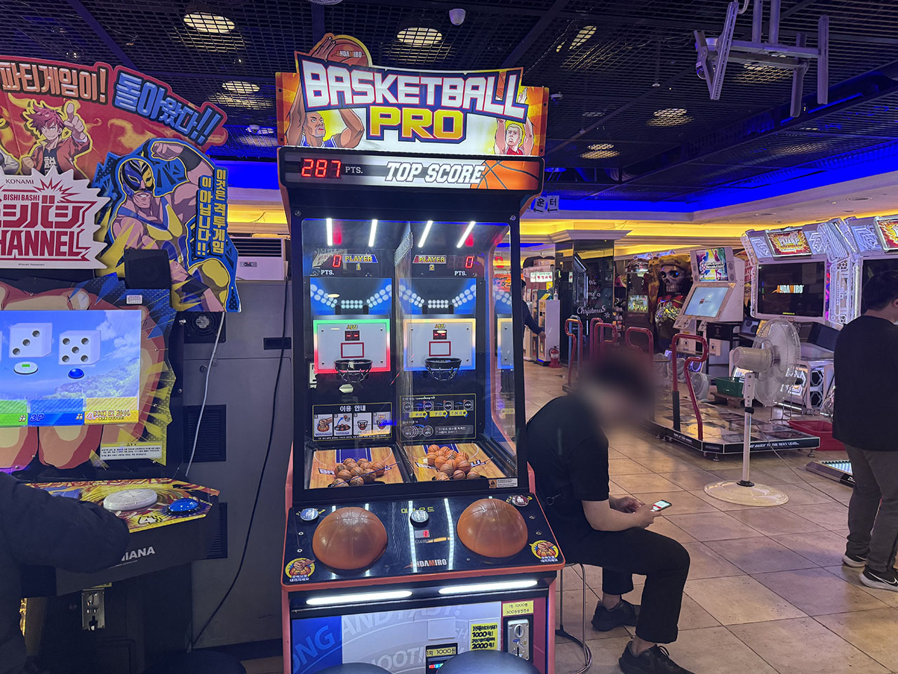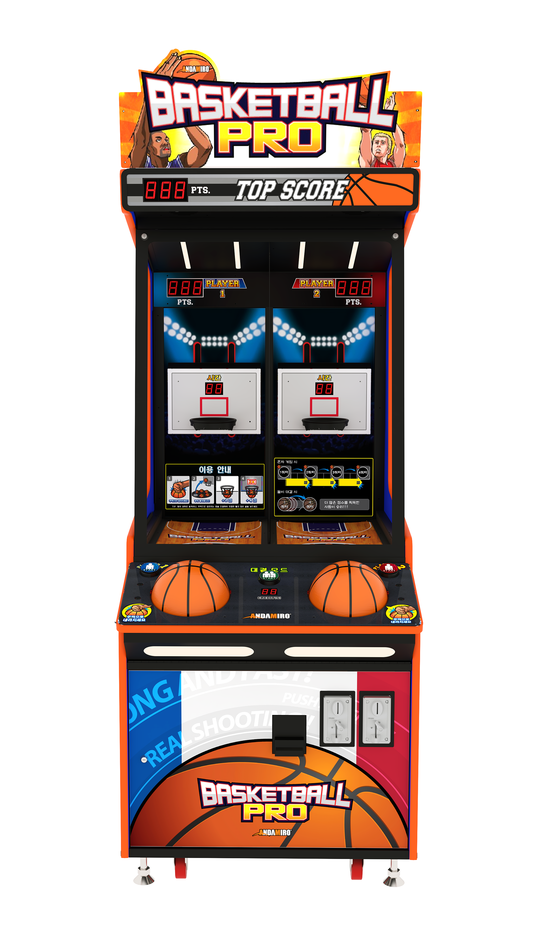 두 명의 플레이어 스테이션은 나란히 대결하거나 개인 플레이를 지원하며, 두 개의 백보드는 미니 공을 튕겨넘기며 움직입니다.